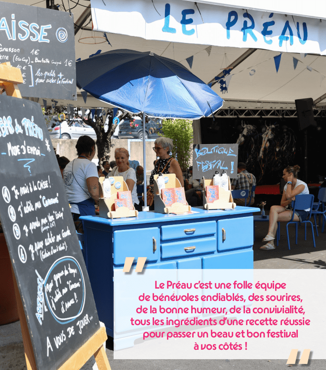 Au préau, à l’école Hubert Monnais, c’est un lieu de vie et de rencontre du festival, installé dans la charmante cour de l’école Hubert Monnais, le Préau vous attend dès le vendredi soir et tout au long du weekend pour boire un verre, vous restaurer, vous reposer, rencontrer des artistes, lire un livre ou prendre le temps, tout simplement.